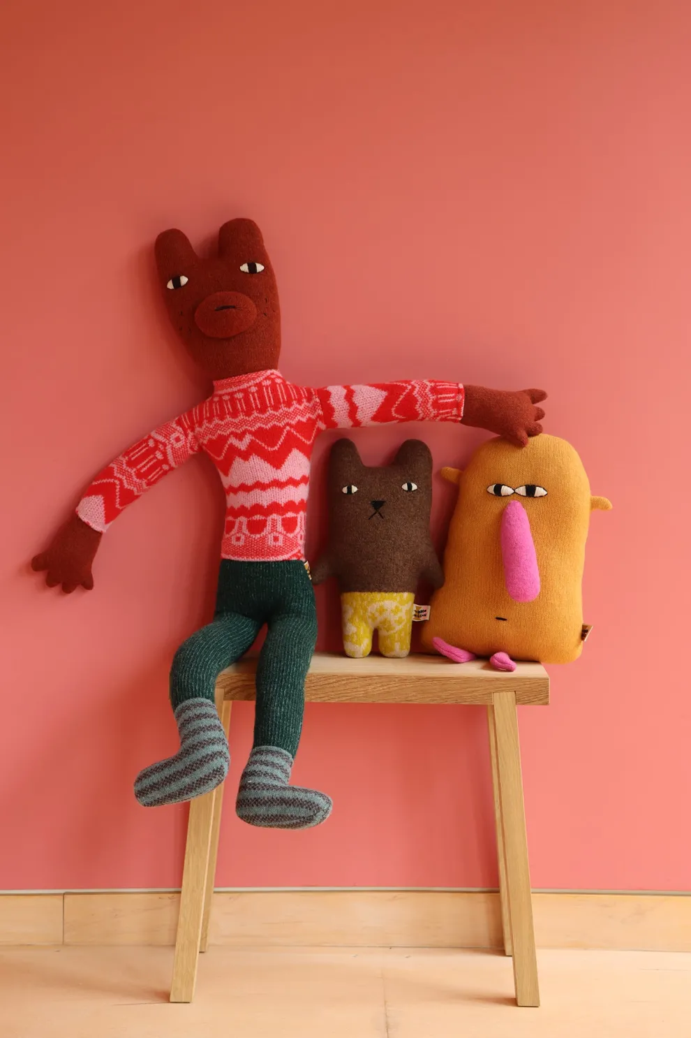 We knit all of our lambswool creatures in the UK using the softest yarns. Each one is assembled and embroidered by hand – you can find the name of each creature’s maker on its cardboard tag. We package each one in a drawstring cotton bag and we give each creature a little squeeze before sending it to its new home.