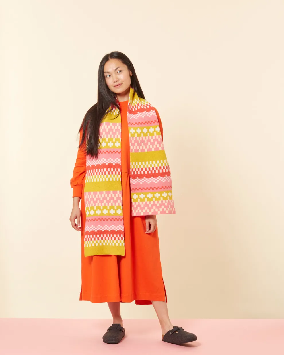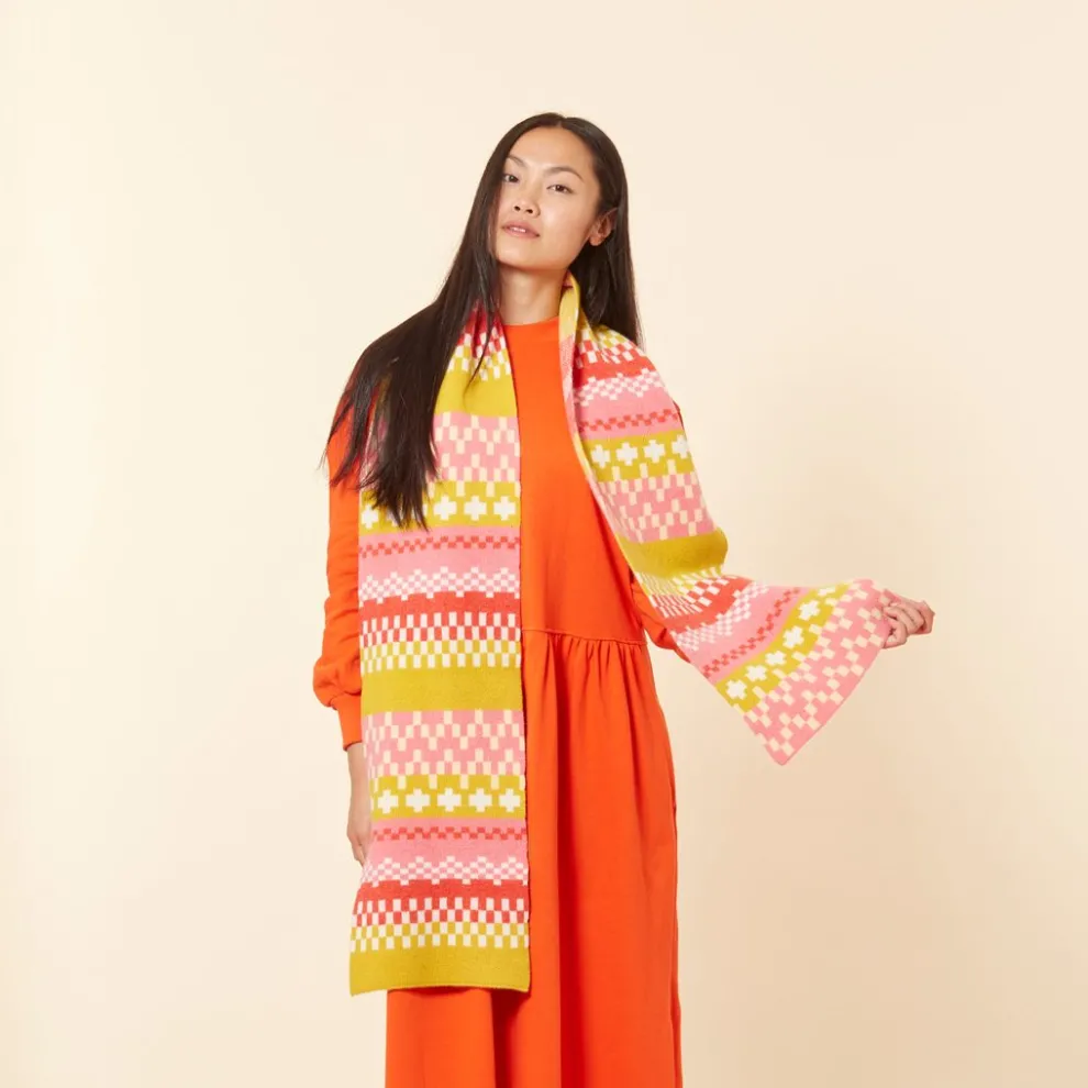Wrap yourself up in this brightly coloured lambswool scarf. The pattern takes its inspiration from Fair Isle knit designs – it’s literally a big stitch!