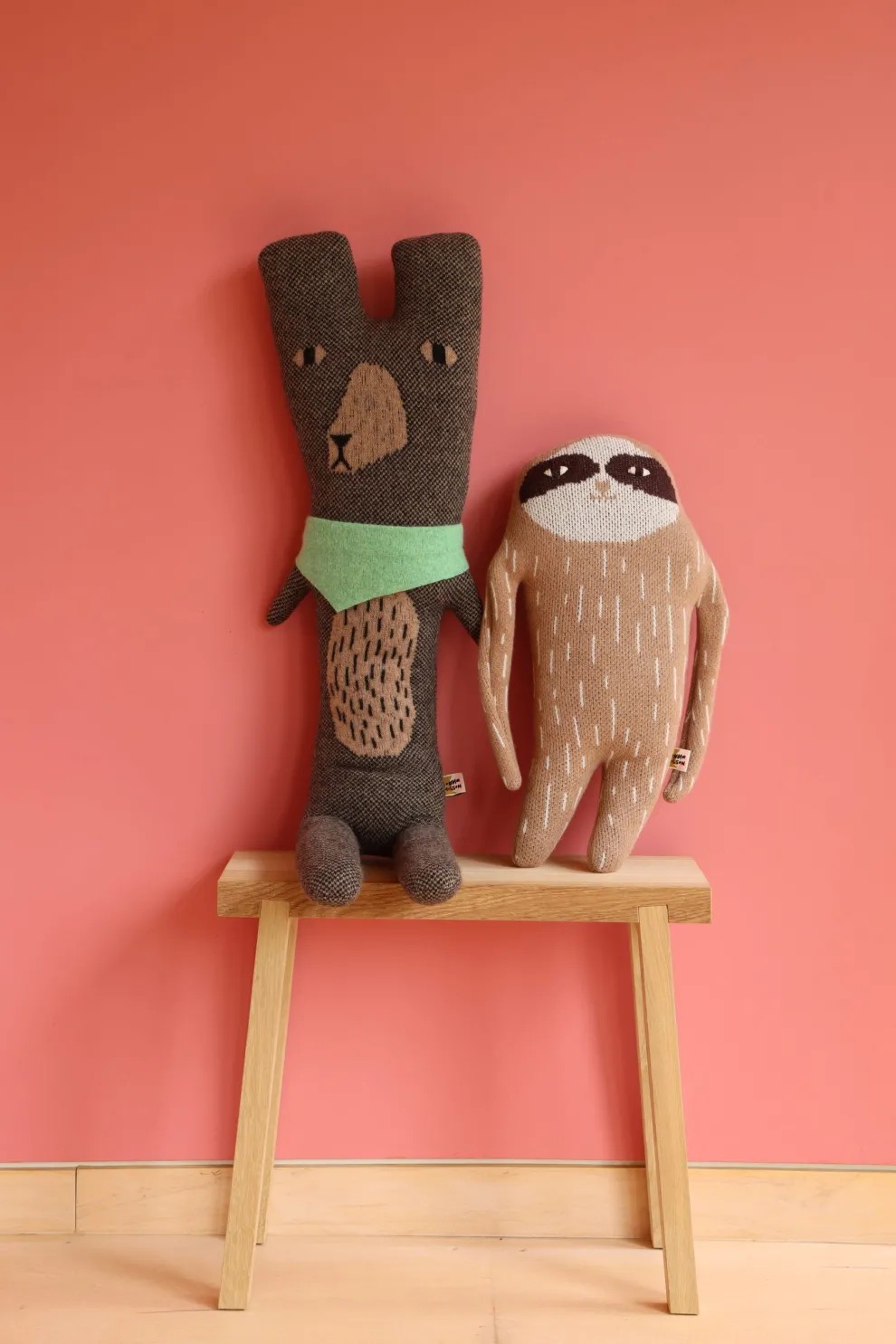 We knit all of our lambswool creatures in the UK using the softest yarns. Each one is assembled and embroidered by hand – you can find the name of each creature’s maker on its cardboard tag. We package each one in a drawstring cotton bag and we give each creature a little squeeze before sending it to its new home.