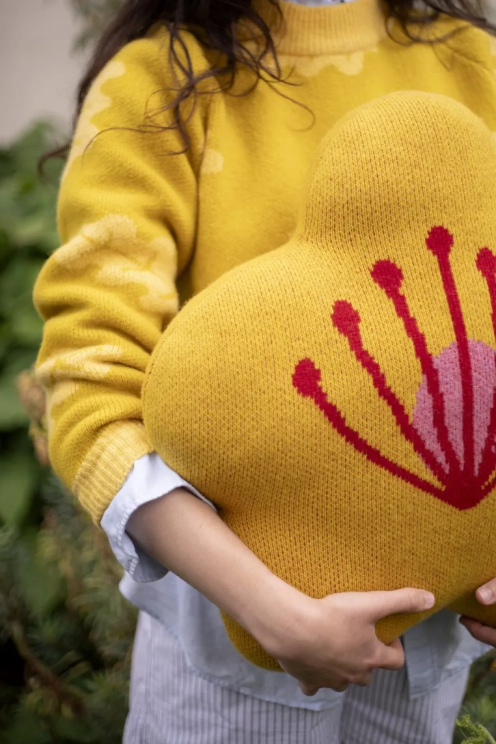 With blue petals and pink and brown details, each plump cushion is knitted from 100% lambswool yarn and stuffed with recycled polyester.