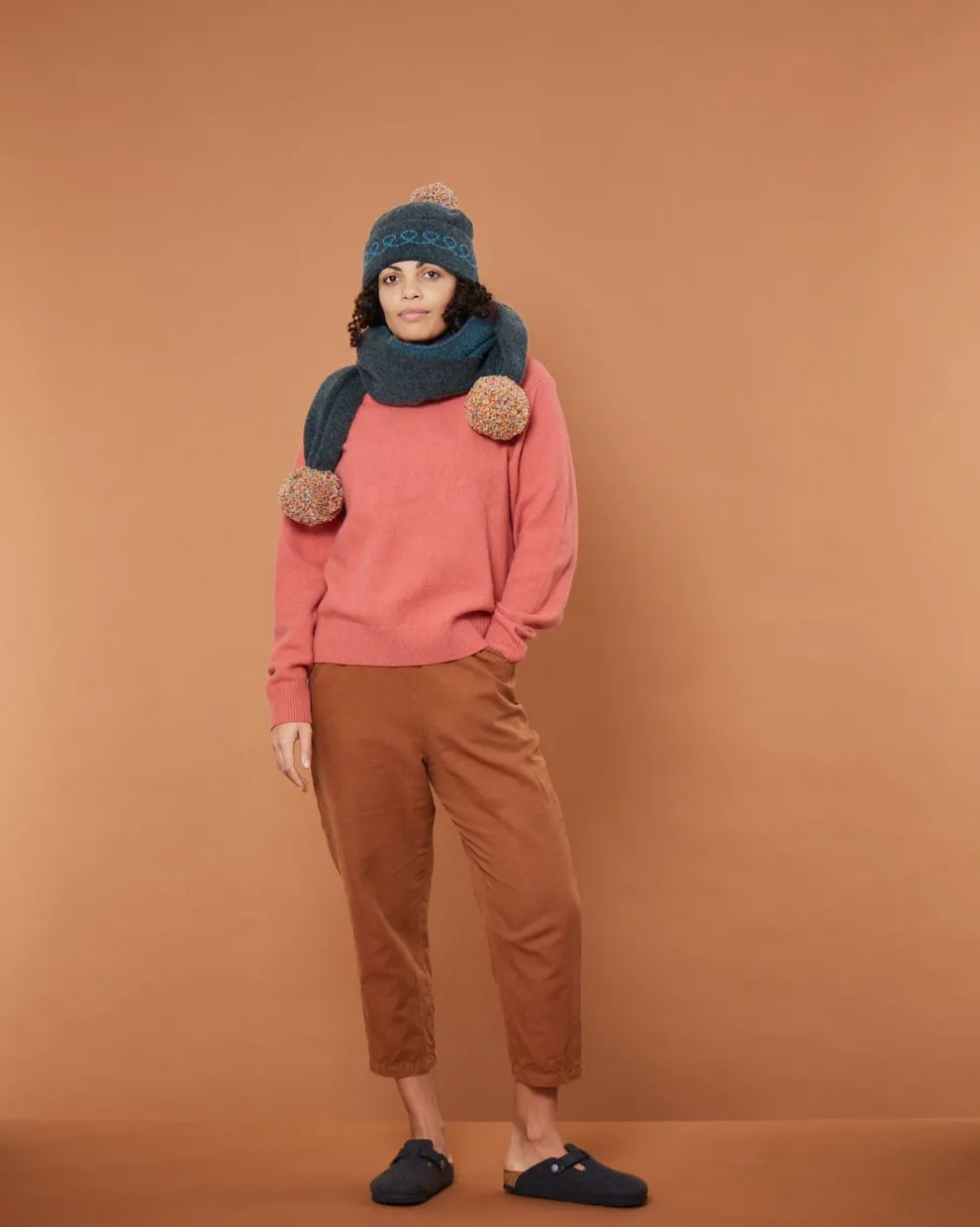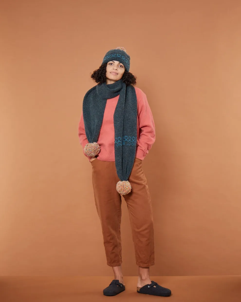 By spinning the recycled fibres from once-loved acrylic knitwear together with a mixture of mohair, wool and cashmere, textile designer and researcher Cathryn has produced a range of upcycled yarns – strong, beautiful, luxurious, and more valuable than the sum of their parts. We’ve combined Cathryn’s Super Lux Yarn with a soft lambswool yarn to knit the two-tone fabric of this One More Loop Scarf, adding pompoms created from our own waste yarns.