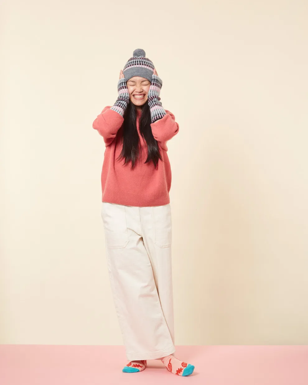 This knitted beanie is a harmonious clash of colour and the perfect topper to your winter wardrobe.