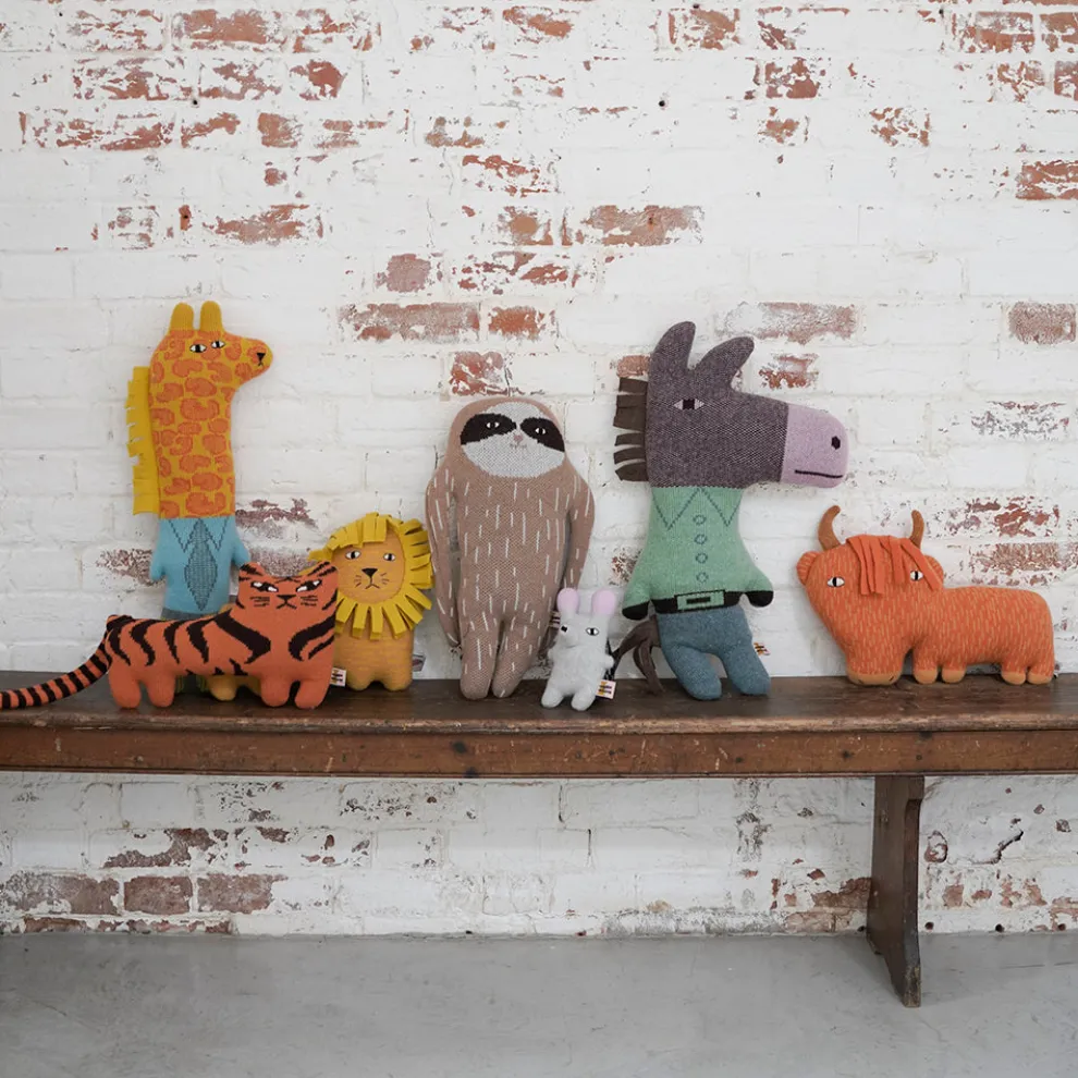 We knit all of our lambswool creatures in the UK using the softest yarns. Each one is assembled and embroidered by hand – you can find the name of each creature’s maker on its cardboard tag. We package each one in a drawstring cotton bag and we give each creature a little squeeze before sending it to its new home.